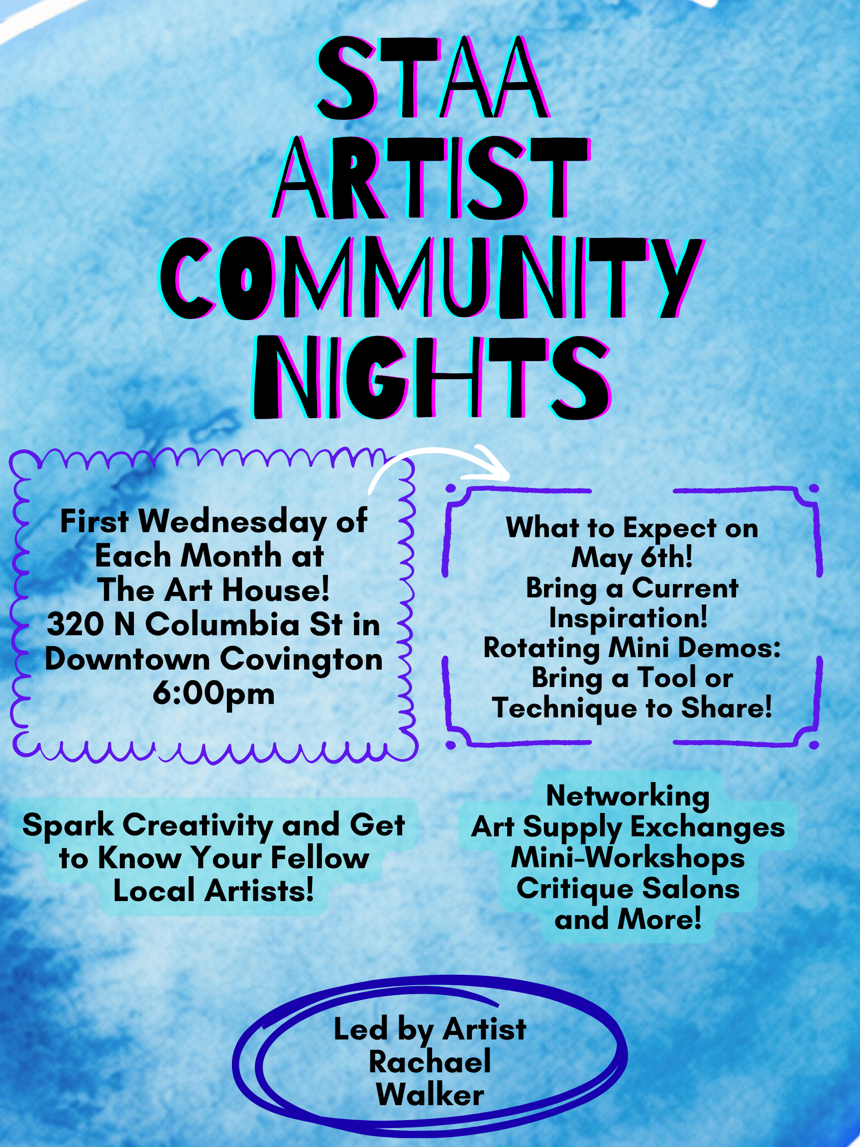 STAA has grown into an organization with over 300 members and supporters. Serving as a catalyst for the arts, the organization’s Art House building in downtown Covington serves the needs of emerging and established artists. STAA provides arts education to artists of all ages and experience levels through a wide variety of media, exhibition opportunities to artist members and visiting artists, and direct community engagement arts market to the community.