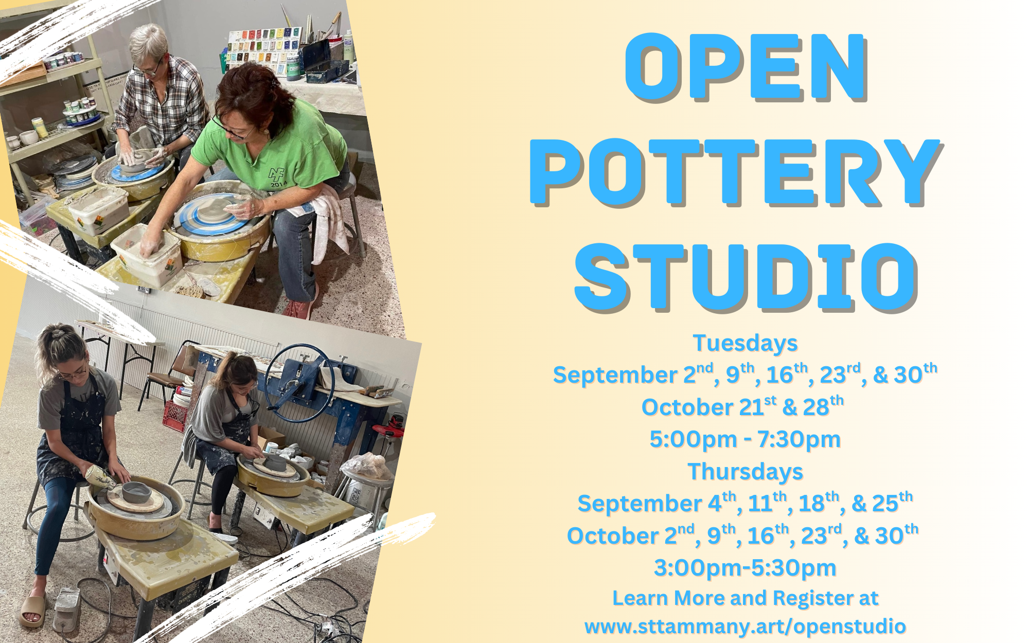 Open Pottery Studio allows individuals with previous pottery knowledge to freely create new works of art! A studio monitor will be in attendance to answer questions and provide advice, but only minimal instruction is provided. Students receive as much low-fire Gator White clay as they need for $1.00/lb, use of the pottery wheel, slab roller, and all tools and glazes. Students may also bring any low-fire clay, low-fire glazes, and tools, they may want to use. STAA will handle all bisque and glaze firing on site. Firings will take place at the end of the third and fourth weeks of studio, so make sure your pieces are bone dry and ready! Any additional firings will be a $15 charge per firing to the student.