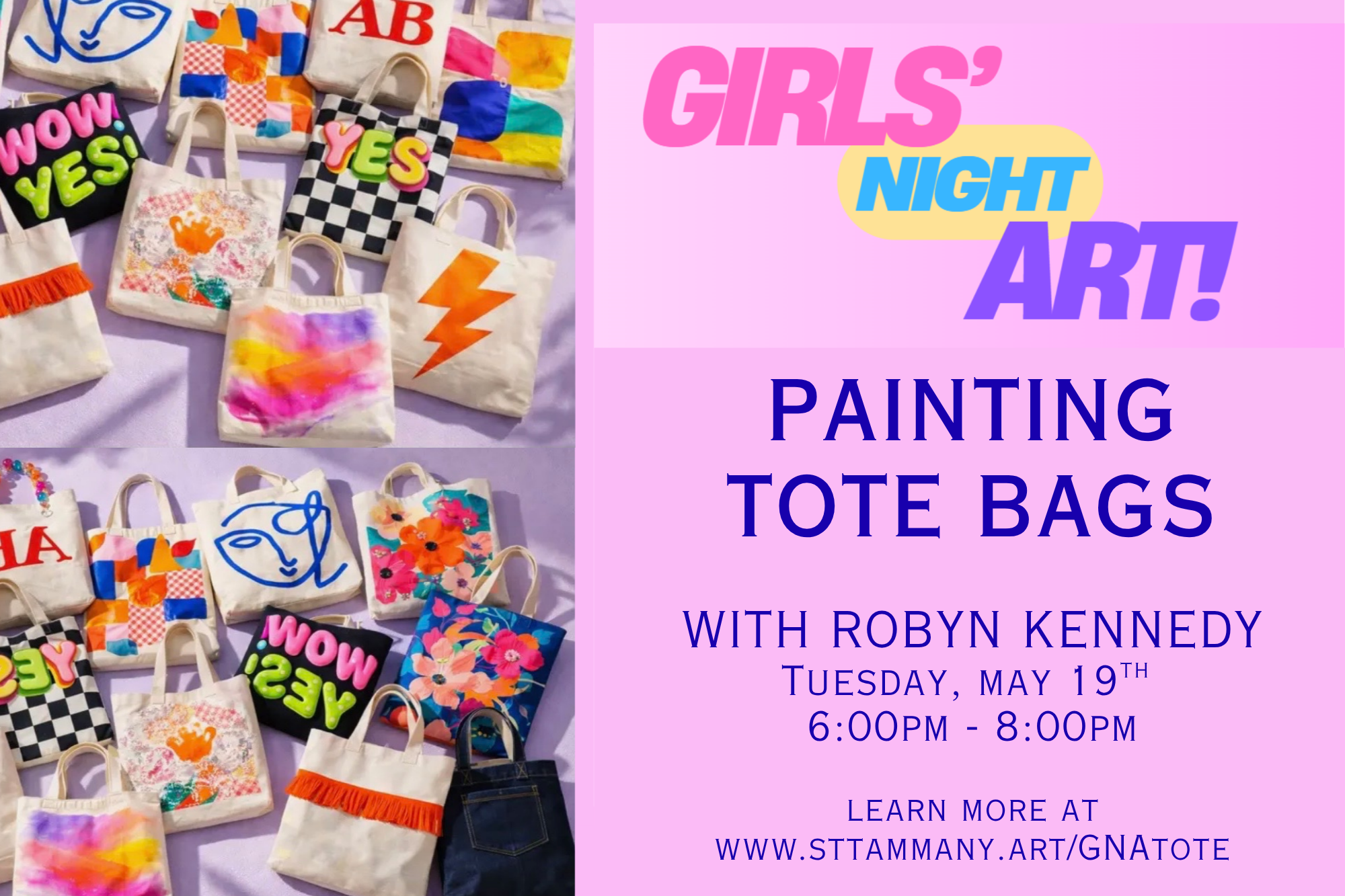 Join STAA and instructor Robyn Kennedy for a tote bag painting party! The single-night workshop will encourage students to use paints, markers, and stencils, and embellishments to create custom pieces of functional art! Students are asked to bring their own tote bags, but all other supplies are provided. Come and explore painting on an unconventional surface to stretch your creative muscles!